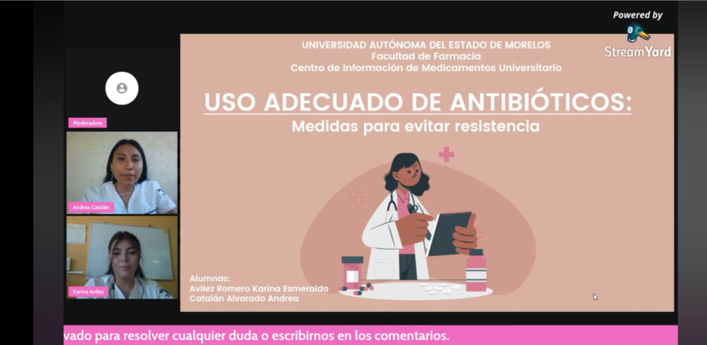 Este día se llevó a cabo la plática informativa virtual Uso adecuado de los antibióticos, como parte de las actividades del Centro de Información de Medicamentos Universitario (CIMU) de la Facultad de Farmacia, en la cual, las alumnas de esta unidad académica Andrea Catalán y Karina Avilés, difundieron información para todo el público.