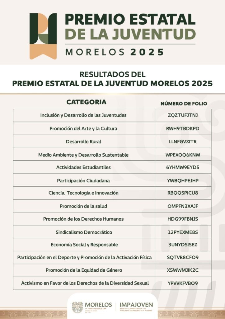El Gobierno de Morelos “La tierra que nos une”, a través del Instituto Morelense de las Personas Adolescentes y Jóvenes (Impajoven), informa los resultados oficiales del Premio Estatal de la Juventud 2025, el máximo reconocimiento otorgado a quienes desarrollan proyectos con impacto social, cultural, ambiental, deportivo, científico y comunitario.