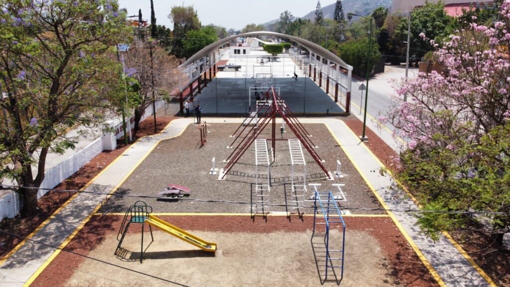 Asimismo se colocaron 612 metros cúbicos de arena de tezontle roja y negra, se suministró y colocó malla ciclónica de dos metros de altura en el perímetro de la cancha de la cancha de usos múltiples, suministro y colocación de 18 aparatos para hacer ejercicio, seis juegos infantiles, cuatro aparatos para calistenia, mobiliario urbano y pintura para la barda perimetral.