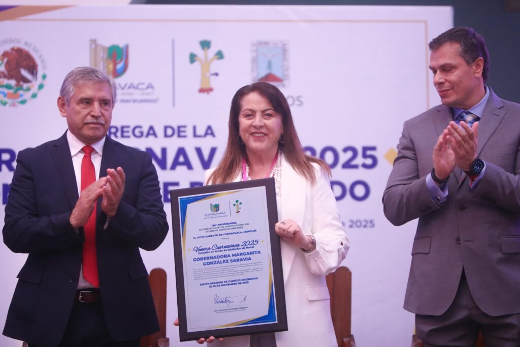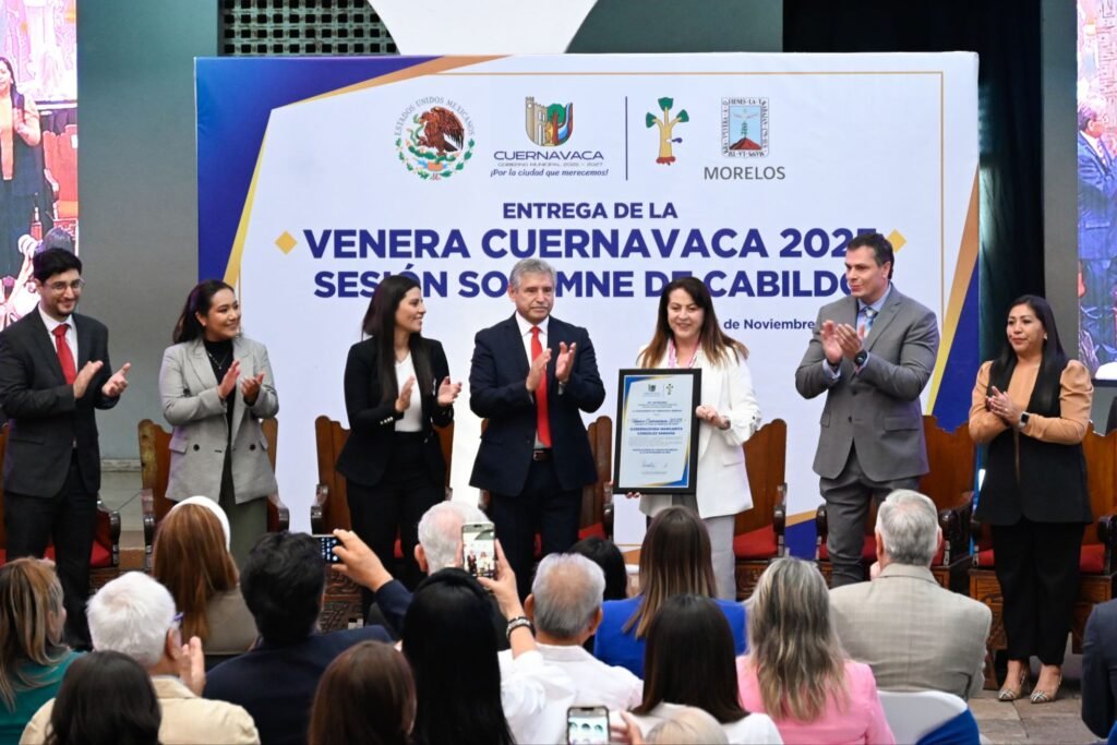 La gobernadora de Morelos, Margarita González Saravia, recibió la distinción Venera Cuernavaca 2025, otorgada por el Ayuntamiento de Cuernavaca durante sesión solemne de cabildo realizada en el Museo de la Ciudad. En este acto fue reconocida por su liderazgo, vocación de servicio y por marcar un hecho histórico al convertirse en 2024 en la primera mujer en encabezar el Poder Ejecutivo estatal.