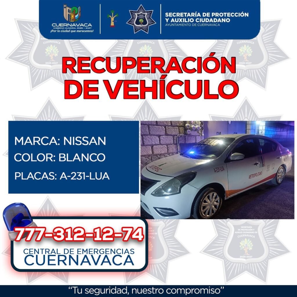 Se trata de un vehículo marca Nissan, tipo Versa, rotulado como taxi del municipio de Jiutepec, con placas de circulación A-231-LUA del estado de Morelos, el cual había sido robado con violencia en la colonia Vicente Estrada Cajigal.
