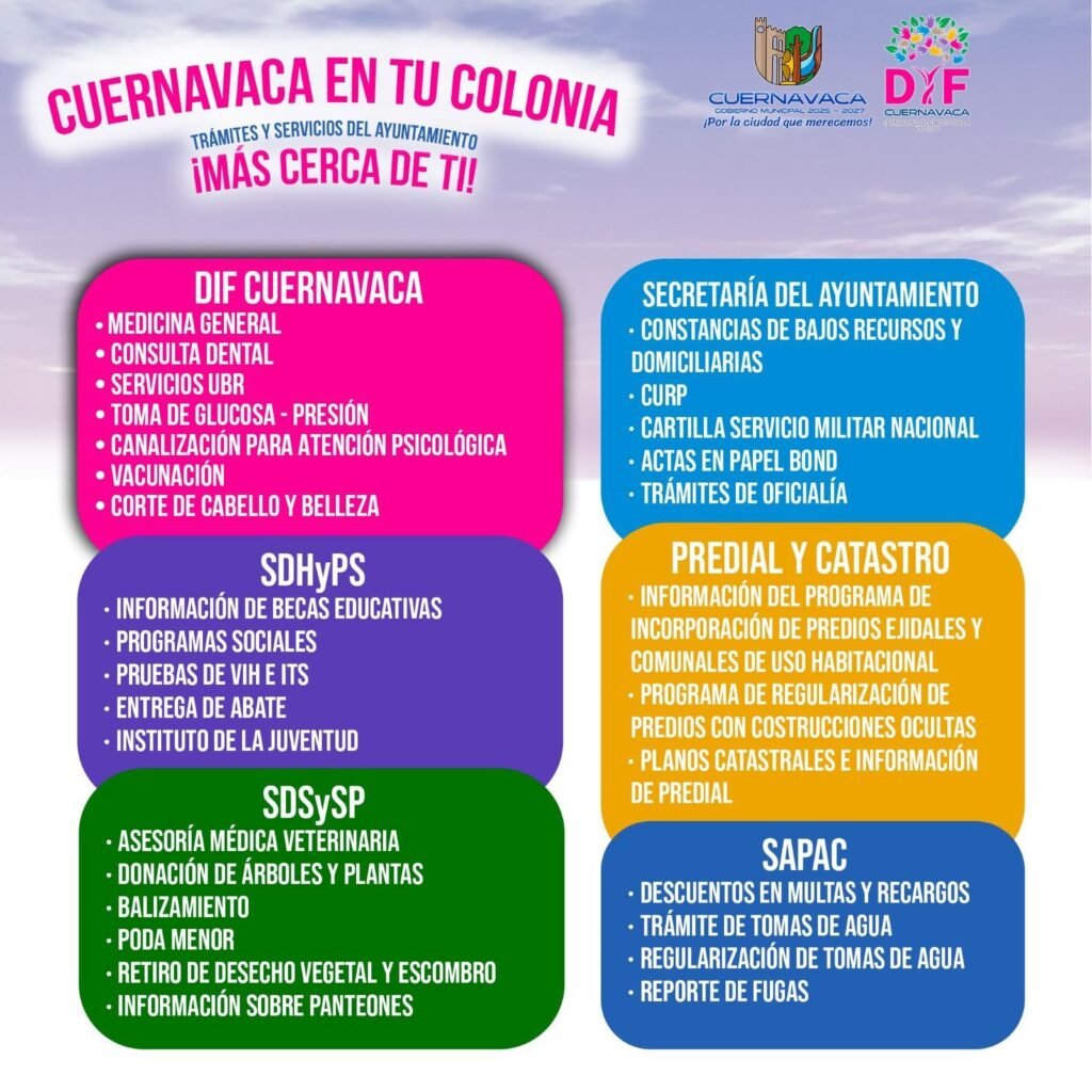 Con el objetivo de que ninguna familia quede sin atención, el Sistema Municipal DIF Cuernavaca retomará, a partir del jueves 29 de enero de 2026, el programa “Cuernavaca en tu colonia”. Esta estrategia acerca servicios médicos, programas sociales, trámites y apoyos gratuitos directamente a las comunidades, fortaleciendo la cercanía y el bienestar de la población.