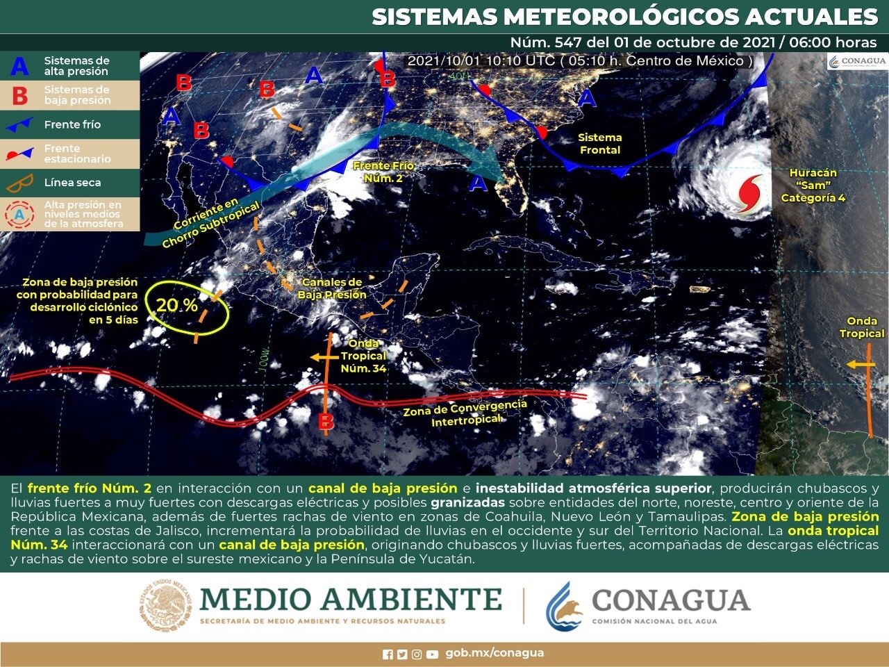 La presencia de la onda tropical no. 34 en el Pacífico al sur de Jalisco y Michoacán, favorecerá ingreso de humedad y condiciones de inestabilidad atmosférica sobre estados del occidente del país y, en menor grado, de la región central.