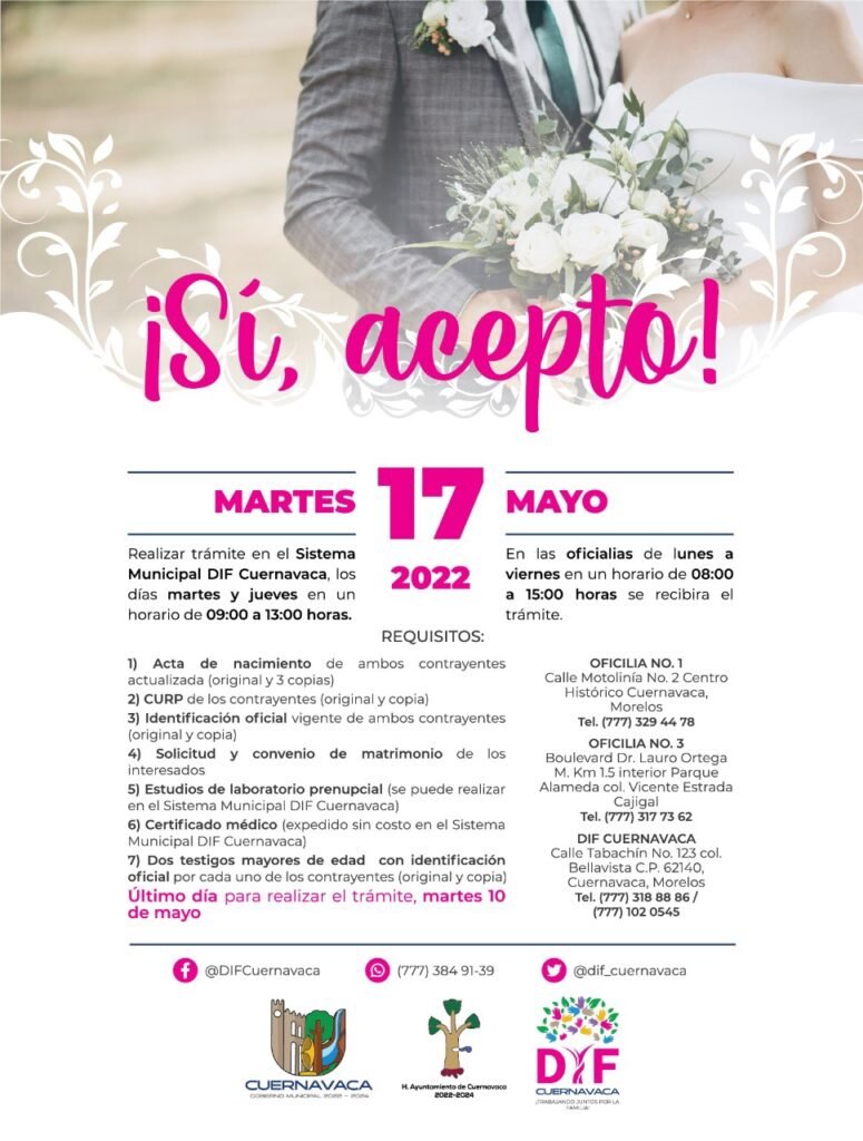 Para promover de manera complementaria el desarrollo y el fortalecimiento integral de las familias, el Sistema Municipal DIF Cuernavaca, en coordinación con la Secretaría del Ayuntamiento Cuernavaca a través de las Oficialías 1 y 3 del Registro Civil, invitan a las y los ciudadanos que deseen formalizar legalmente su relación de vida, a participar en la campaña de matrimonios colectivos 2022, “Sí, acepto”, que se celebrará el 17 de mayo de 2022 en el jardín “La Estancia”.