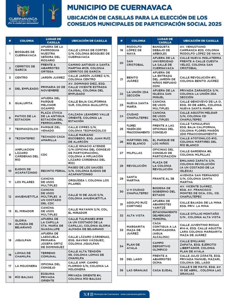 El Ayuntamiento de Cuernavaca está listo para la elección de 36 Consejos de Participación Social, que este domingo 23 de noviembre serán elegidos por sus propios vecinos mediante voto popular. Estos cargos, de carácter honorífico, tendrán una duración de tres años. Las casillas abrirán de 9:00 a 16:00 horas.